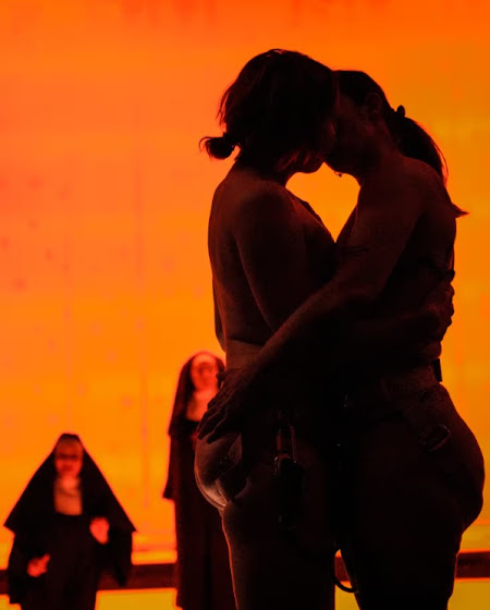 la artista de performance extrema florentina holzinger está detrás de la sorprendente adaptación en la cual se ve a todo su elenco femenino interpretando a monjas que se despojan de sus hábitos durante todo el espectáculo sensual, poetic and wild. ("sensual, poético y salvaje.")
